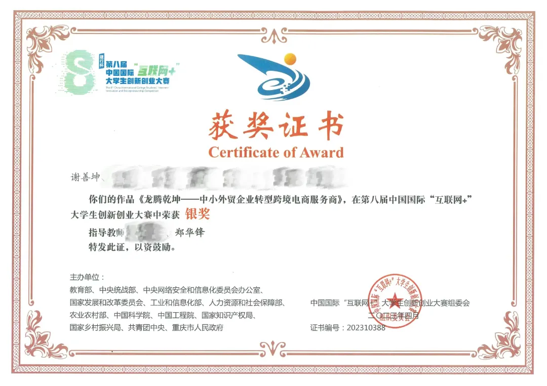 在郑华锋老师的指导下,参加第八届中国国际“互联网+”大学生创新创业大赛,孵化的项目荣获高教主赛道银奖。